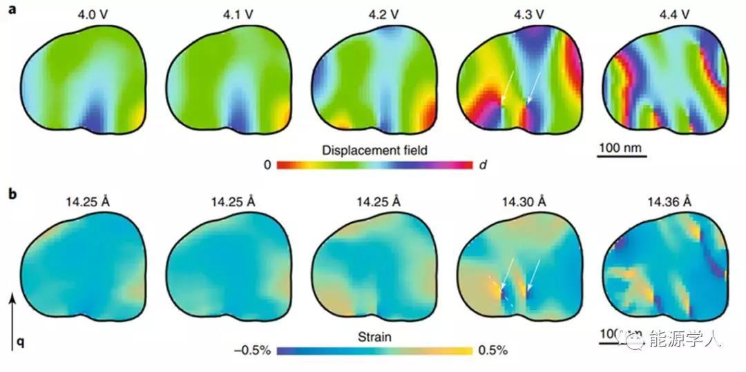 通過使用原位布拉格相干衍射成像(BCDI)技術(shù),作者發(fā)現(xiàn)當(dāng)充電到4.3V時,在納米粒子的主體中有兩個位錯形成。在隨后的充電過程中,位錯密度逐漸增加,在4.4V時出現(xiàn)位錯網(wǎng)絡(luò)。