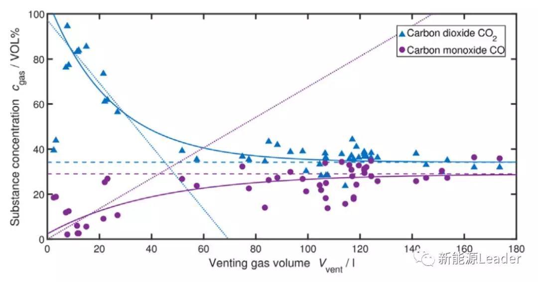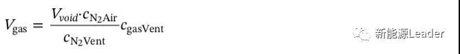 為了解決這一問題,Sascha Koch選擇了N2作為標(biāo)準(zhǔn)氣體,N2在空氣中的含量為78.084%,通常我們認(rèn)為N2是一種惰性氣體,在鋰離子電池?zé)崾Э刂胁粫l(fā)生反應(yīng),因此我們能夠通過對比熱失控前后N2的濃度變化計算得到鋰離子電池?zé)崾Э禺a(chǎn)生氣體的數(shù)量,如下式所示。式中Vgas為相應(yīng)氣體的數(shù)量,Vvoid容器內(nèi)的空體積,CN2Vent和CgasVent為熱失控后容器內(nèi)N2的濃度和相應(yīng)氣體的濃度。