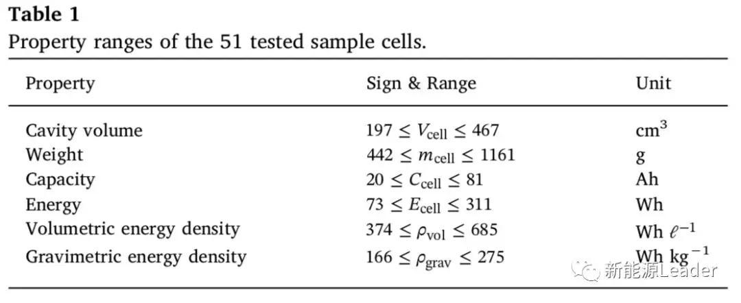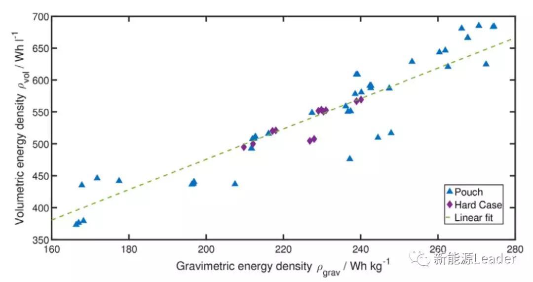 為了獲取不同類型電池的測試數(shù)據(jù),Sascha Koch共計對51只動力電池進(jìn)行了測試,其中41只為軟包電池,10只為硬殼電池,所有電池均為NCM/石墨體系,電解液鋰鹽為LiPF6,以及多種類型的溶劑,包括EC、DMC、DEC和EMC等,51種電池的基本信息如下表所示。51種電池中包括“功率型”電池和“能量型”電池,下圖展示了電池的體積能量密度與重量能量密度之間的關(guān)系,其中綠色線段為擬合結(jié)果,從圖中能夠看到51款動力電池體積能量密度平均是重量能量密度的2.38倍。