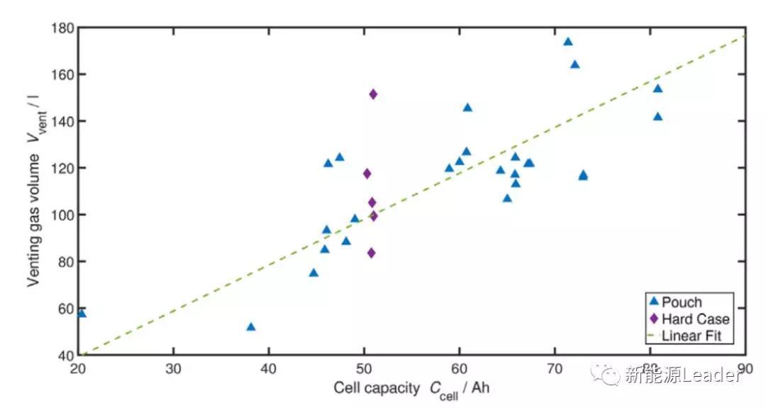 從前面的研究發(fā)現(xiàn),鋰離子電池在熱失控中產(chǎn)生的不同種類氣體的濃度與產(chǎn)生的氣體數(shù)量之間沒有直接的關(guān)系,但是熱失控中產(chǎn)生氣體的體積卻與鋰離子電池的容量存在密切的關(guān)系(如下圖所示),通過對數(shù)據(jù)進(jìn)行擬合,發(fā)現(xiàn)熱失控中鋰離子電池產(chǎn)生氣體的數(shù)量與電池容量之間存在線性關(guān)系,平均每個Ah的容量可以產(chǎn)生1.96L的氣體。