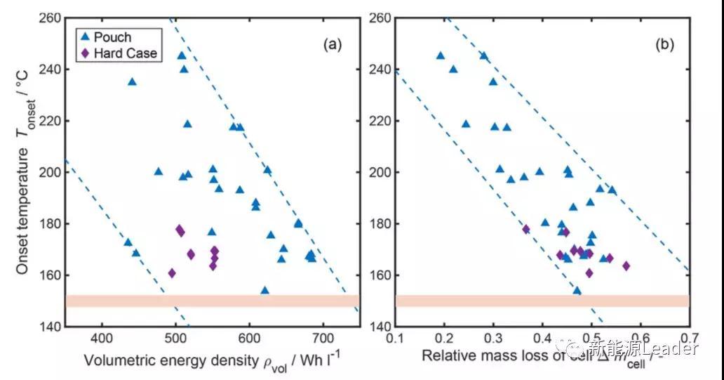 影響鋰離子電池?zé)崾Э剡^程的不僅僅是容量,能量密度對鋰離子電池的熱失控也有顯著的影響,例如從下圖a中我們能夠看到隨著鋰離子電池體積能量密度的不斷上升,鋰離子電池的熱失控觸發(fā)溫度也在持續(xù)的降低,從擬合結(jié)果來看,電池的體積能量密度每提高1Wh/L,電池的熱失控觸發(fā)溫度就要下降0.42℃。從下圖b能夠看到,鋰離子電池?zé)崾Э赜|發(fā)溫度越高,則熱失控中鋰離子電池的質(zhì)量損失越小,反之亦然。從上面的分析可以看到,鋰離子電池能量密度越高,則電池?zé)岱€(wěn)定性越差、熱失控越劇烈。