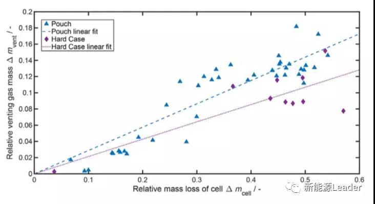 電池結(jié)構(gòu)也會影響鋰離子電池的熱失控行為,例如從下圖能夠看到,對于軟包電池產(chǎn)生氣體的質(zhì)量占電池質(zhì)量損失的比例較高,而硬殼電池產(chǎn)生氣體的質(zhì)量占質(zhì)量損失的比例則相對較低。這主要是因為硬殼電池能在內(nèi)部積累更大的壓力,最終沿著泄壓口釋放氣體,高壓氣體攜帶著部分固體材料離開電池,導(dǎo)致固體損失占比增加,而軟包電池結(jié)構(gòu)強(qiáng)度較低,因此氣體更容易泄漏,因此不會將過多的固體材料帶離電池。