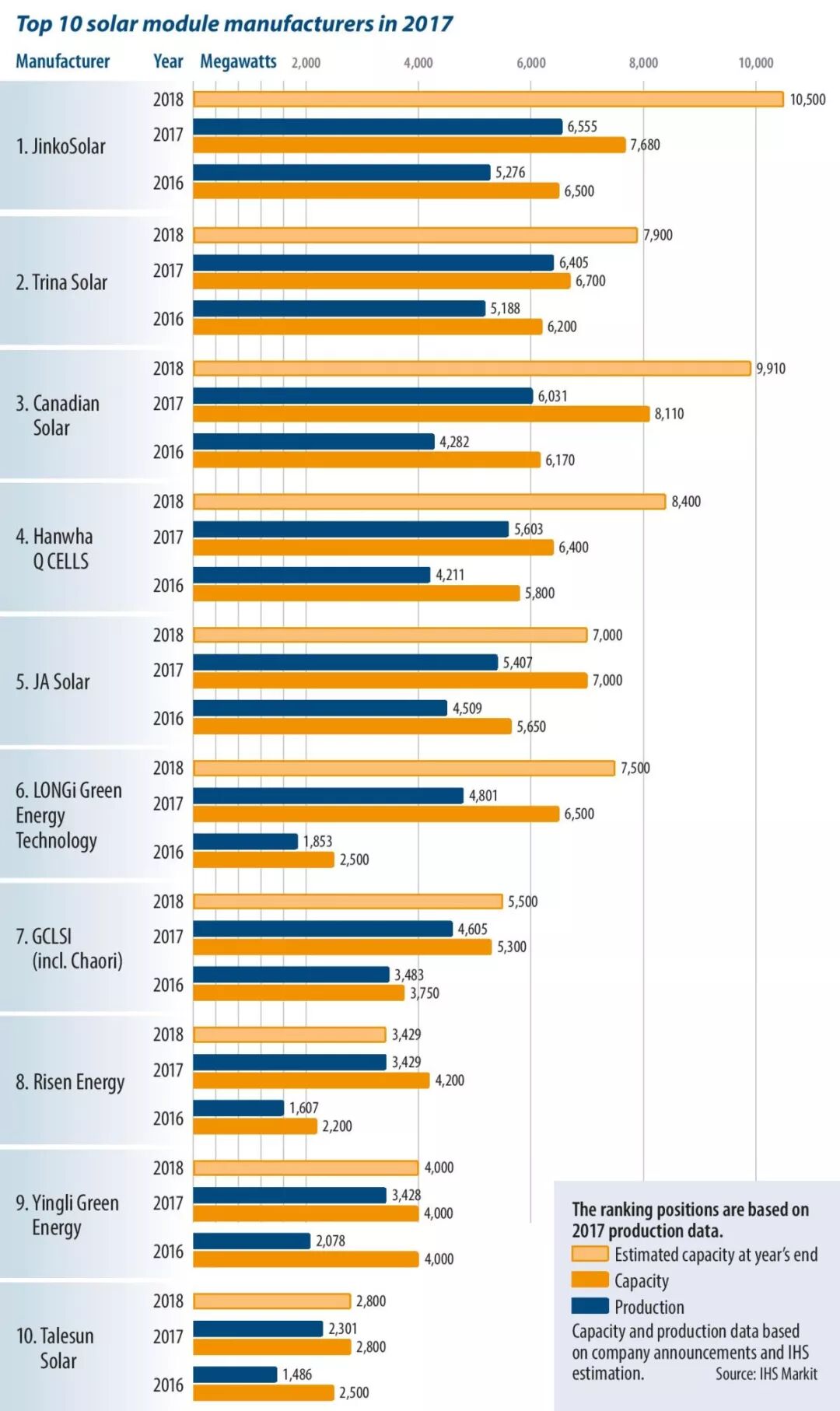 中國在供應和需求方面都是主要參與者。IHS Markit的高級分析師Karl Melkonyan解釋說:“在2017年,中國的全球市場份額達到頂峰,約為53%。組件制造商繼續(xù)擴張,在2017年將新增近1000萬千瓦的產(chǎn)能。
