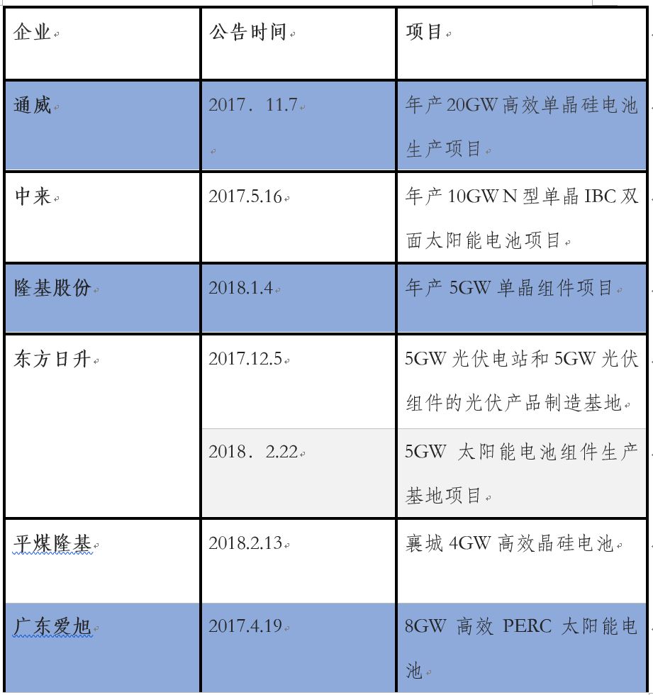 2018光伏電池片/組件企業(yè)擴產(chǎn)項目