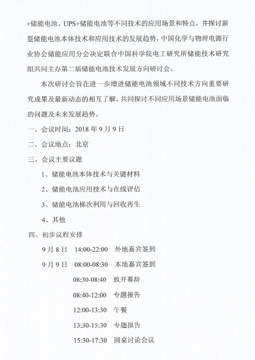 為進一步討論新形勢下容量型調峰電池、功率型調頻電池、光伏+儲能電池、UPS+儲能電池等不同技術的應用場景和特點,并探討新型儲能電池本體技術和應用技術的發(fā)展趨勢,中國化學與物理電源行業(yè)協(xié)會儲能應用分會決定聯(lián)合中國科學院電工研究所儲能技術研究組共同主辦第二屆儲能電池技術發(fā)展方向研討會。