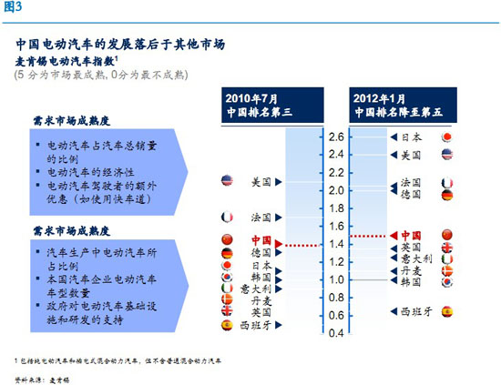 麥肯錫的電動(dòng)汽車指數(shù)可以被用來衡量一個(gè)國(guó)家是否有足夠準(zhǔn)備支持電動(dòng)汽車產(chǎn)業(yè)。該指數(shù)從供給和需求角度對(duì)一個(gè)國(guó)家的電動(dòng)汽車成熟度進(jìn)行評(píng)估:根據(jù)本國(guó)汽車廠商規(guī)劃的電動(dòng)汽車產(chǎn)量等指標(biāo)進(jìn)行供給衡量,根據(jù)對(duì)車主提供的優(yōu)惠措施和基礎(chǔ)設(shè)施投資水平等指標(biāo)進(jìn)行需求衡量。麥肯錫的電動(dòng)汽車指數(shù)表明中國(guó)在供給和需求的得分都相對(duì)較低。而且中國(guó)電動(dòng)汽車整體成熟度從2010年7月的第三位降至2012年2月的第五位,排在日本、美國(guó)、法國(guó)和德國(guó)之后(圖3)。