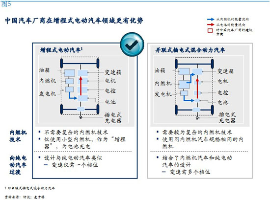 中國(guó)式電動(dòng)汽車可能會(huì)是增程式電動(dòng)汽車。我們的研究表明,增程式電動(dòng)汽車(即串聯(lián)式插電式混合動(dòng)力汽車)— 內(nèi)置小型內(nèi)燃機(jī)以在行駛過程為電池不斷充電的電動(dòng)汽車,可能對(duì)于中國(guó)相對(duì)滯后的汽車行業(yè)來講成本更低、也更容易實(shí)施。