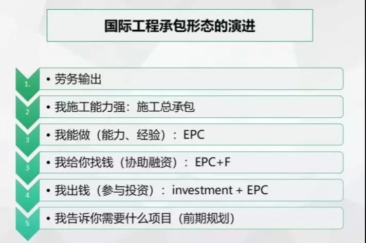 他說,國際工程承包形態(tài)的演進(jìn)經(jīng)歷了五種形式(如下):