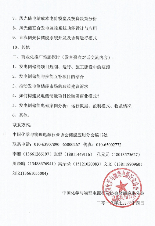 為進一步推進儲能在發(fā)電側(cè)上的項目規(guī)劃、安全施工、系統(tǒng)集成技術應用、運營模式、電網(wǎng)接入、標準體系、風光儲電站考核機制、調(diào)度模式、儲能項目備案、審批流程和體制機制等方面展開深入討論,中國化學與物理電源行業(yè)協(xié)會儲能應用分會聯(lián)合全國微電網(wǎng)與分布式電源并網(wǎng)標準化技術委員會、中國電力工程顧問集團西北電力設計院有限公司、中國電建集團西北勘測設計研究院有限公司、中國科學院電工研究所儲能技術組、深圳市科陸電子科技股份有限公司等單位聯(lián)合主辦“首屆全國發(fā)電側(cè)儲能技術與應用高層研討會”,現(xiàn)將有關事項通知如下:
