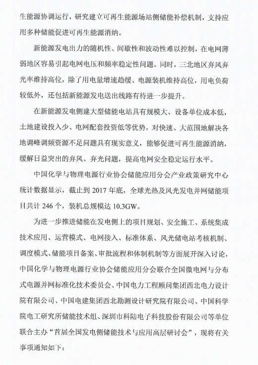 關(guān)于召開首屆發(fā)電側(cè)儲能技術(shù)與應(yīng)用高層研討會的通知