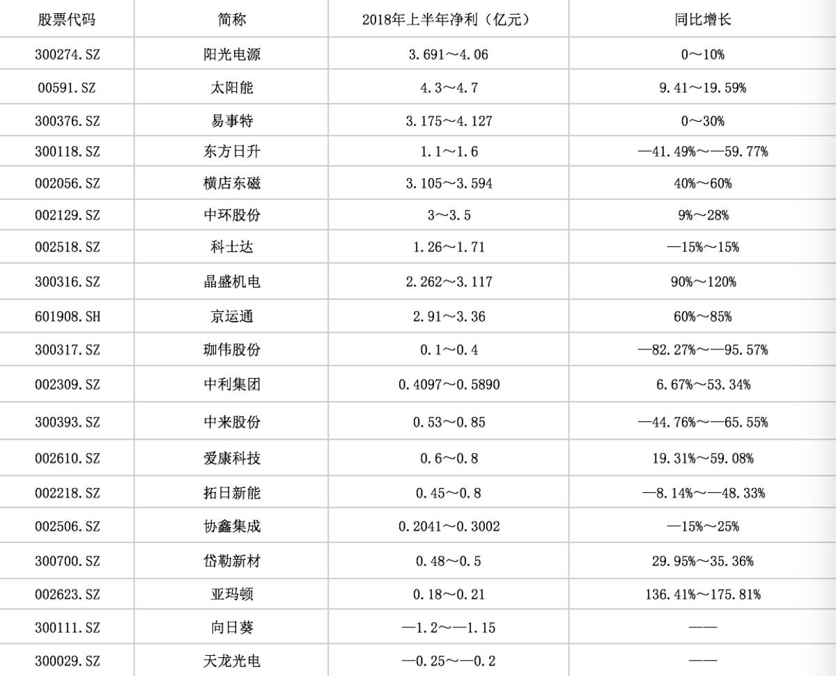 在第一財(cái)經(jīng)梳理的已經(jīng)發(fā)布2018年業(yè)中期預(yù)告的19家光伏行業(yè)上市公司中,有8家企業(yè)預(yù)計(jì)凈利潤出現(xiàn)不同程度的下滑,凈利潤總額約為26.4億元~32.2億元。