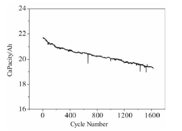 磷酸鐵鋰電池的特點在于安全性高,高倍率充放電特性和較長的循環(huán)壽命。文獻顯示,在充電條件為1C倍率充電至3.65V,然后轉(zhuǎn)恒壓至電流下降到0.02C,之后以1C倍率放電至截止電壓2.0V,循環(huán)1600次之后電池容量仍有初始容量的80%。