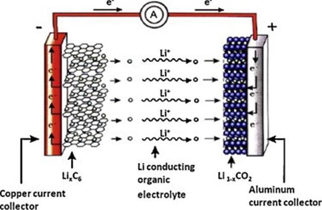 充電時鋰離子從正極材料的晶格中脫出經(jīng)過電解質(zhì)嵌入到負(fù)極材料層中;放電時鋰離子從負(fù)極材料晶格中脫出,經(jīng)過電解質(zhì)嵌入到正極材料中。而電子則通過外電路,形成電流。