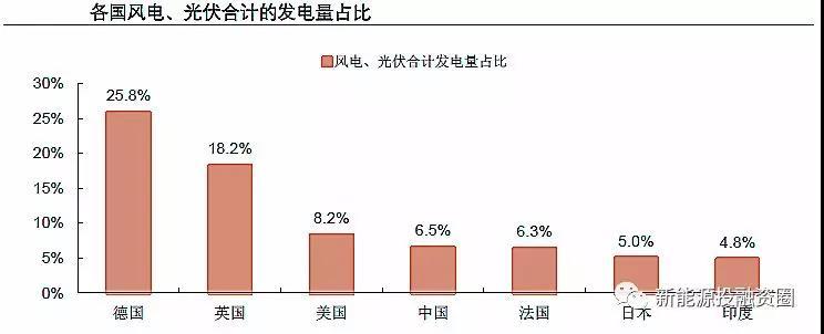 2、不同國家清潔能源占比差異較大,2017年德國風電、光伏合計發(fā)電量占比達25.8%,英國也達18.2%,中國僅6.5%,印度更低;