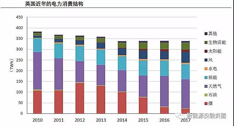近年英國電力需求呈現(xiàn)小幅下滑的趨勢,其電力結(jié)構(gòu)最顯著的變化是煤電占比的大幅下降以及可再生能源電量占比的快速上升。具體來看,煤電發(fā)電量占比從2010年的28.2%下降至2017年的6.7%,風電、光伏、生物質(zhì)三大類可再生能源合計的發(fā)電量占比則從2010年的5.9%提升至2017年的27.6%。