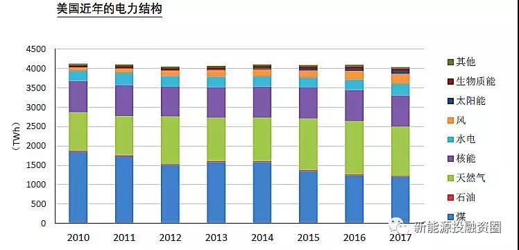 近年美國的電力需求基本穩(wěn)定,發(fā)電量保持在略高于4萬億度電的水平,2017年發(fā)電量約為中國的三分之二。