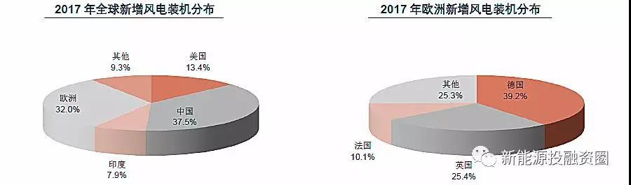 從格局來看,大國引領(lǐng)全球風電行業(yè)的發(fā)展,也占據(jù)著主要的份額。2017年,中國、美國、印度、歐洲占到全球新增裝機的90.7%,新增裝機規(guī)模分別為19.66GW、7.02GW、4.15GW、16.8GW,其中中國新增風電裝機超過全球的三分之一;具體到歐洲市場,德國、英國、法國合計的新增裝機占到歐洲新增裝機的74.7%,裝機規(guī)模分別為6.58 GW、4.27 GW、1.69GW,市場集中度依然很高。