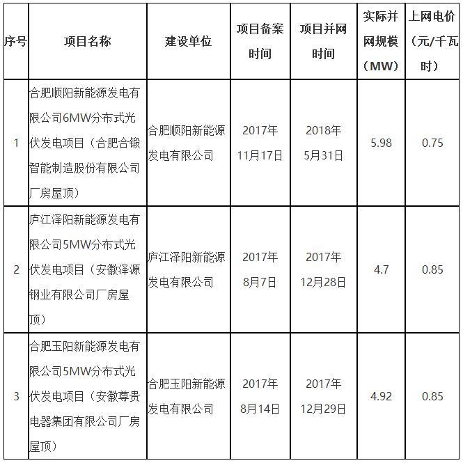 中國(guó)儲(chǔ)能網(wǎng)訊:根據(jù)《國(guó)家發(fā)展改革委國(guó)家能源局關(guān)于完善光伏發(fā)電規(guī)模管理和實(shí)行競(jìng)爭(zhēng)方式配置項(xiàng)目的指導(dǎo)意見》(發(fā)改能源〔2016〕1163號(hào))、《國(guó)家發(fā)展改革委關(guān)于調(diào)整光伏發(fā)電陸上風(fēng)電標(biāo)桿上網(wǎng)電價(jià)的通知》(發(fā)改價(jià)格〔2016〕2729號(hào))和《國(guó)家發(fā)展改革委關(guān)于2018年光伏發(fā)電項(xiàng)目?jī)r(jià)格政策的通知》(發(fā)改價(jià)格規(guī)〔2017〕2196號(hào))等相關(guān)規(guī)定,同意合肥順陽(yáng)新能源發(fā)電有限公司等3家企業(yè)3個(gè)發(fā)電項(xiàng)目(具體項(xiàng)目名單見附件)自并網(wǎng)發(fā)電之日起,執(zhí)行相應(yīng)的上網(wǎng)標(biāo)桿電價(jià)。上網(wǎng)電價(jià)與電網(wǎng)公司結(jié)算部分按我省燃煤機(jī)組標(biāo)桿上網(wǎng)電價(jià)(含脫硫、脫硝、除塵加價(jià))執(zhí)行,可再生能源補(bǔ)貼待納入國(guó)家可再生能源補(bǔ)貼目錄后再行結(jié)算。