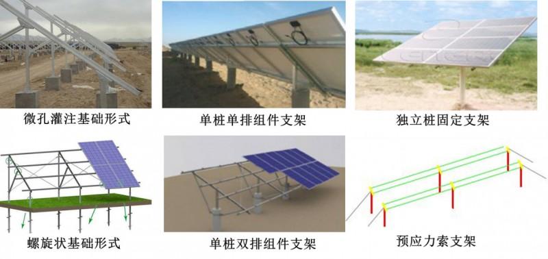 山地主要特點(diǎn)是存在不同朝向的坡,且坡度變化較大,甚至部分區(qū)域存在較深的溝壑或山丘,因此,支架應(yīng)盡量“化整為零”、“變剛為柔”,以提高復(fù)雜地形的適應(yīng)性。對(duì)支架的選擇上可以變長(zhǎng)支架為短支架,或使用更具地形適應(yīng)性的支架形式,如立柱高差可調(diào)節(jié)的單排樁支架、單樁固定支架、仰角可調(diào)式跟蹤支架。對(duì)于柱間崎嶇不平、跨度大的場(chǎng)景應(yīng)使用預(yù)應(yīng)力索支架。