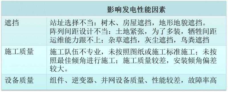 光伏扶貧項(xiàng)目按照建設(shè)地點(diǎn)多年平均輻照水平合理建設(shè)完成后,如果后期運(yùn)維得當(dāng),并能正常上網(wǎng),75%的電站可以實(shí)現(xiàn)預(yù)期的收益。但在第三方檢測(cè)機(jī)構(gòu)協(xié)同檢查過程中發(fā)現(xiàn),有些電站在特定情況下不能正常上網(wǎng),這些影響發(fā)電性能的因素如下表所示: