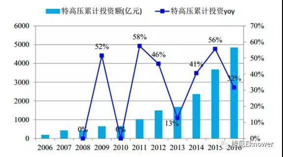 特高壓累計(jì)投資額在2012年之前年均復(fù)合增速在20%左右,2014年開始進(jìn)入快速增長,2015年增速超過50%,增速見頂,2016年特高壓累計(jì)投資額增速同比下降超過20個(gè)百分點(diǎn)。