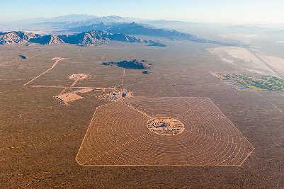 伊萬帕(The Ivanpah)太陽能熱電廠使用排列成同心圓的鏡子,把太陽光聚焦到中央塔,形成高溫,產(chǎn)生蒸汽。這家工廠會采用三座塔,每座塔都有自己的一套鏡子。第一組機組在前部,是最近完成的。今年2月,工人們已開始安裝鏡子,可以看到,就在圖中左上角和場地右側(cè)。來源:麻省理工科技創(chuàng)業(yè)