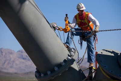 這些圖中,是一座龐大的太陽能熱發(fā)電廠,是有史以來規(guī)模最大的,正開始出現(xiàn)在拉斯維加斯(Las Vegas)城外的曠野上。這項耗資22億美元的工程正在建設(shè)之中,建設(shè)者是加州(California)奧克蘭(Oakland)的布萊特索斯公司(Brightsource),綿延3600畝,靠近加州伊萬帕(Ivanpah)。完工后,在陽光明媚的日子,可產(chǎn)生370兆瓦的電力。