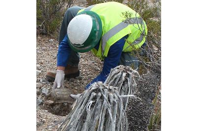 布萊特索斯公司發(fā)現(xiàn)了數(shù)量驚人沙漠陸龜,就在伊萬帕的場地。生物學家已經(jīng)集中這些龜,正在重新安置,也在進行監(jiān)測。這幅圖像顯示,在去年9月,工人們把一只龜安置在新洞穴附近,就在伊萬帕場地外。來源:麻省理工科技創(chuàng)業(yè)公司