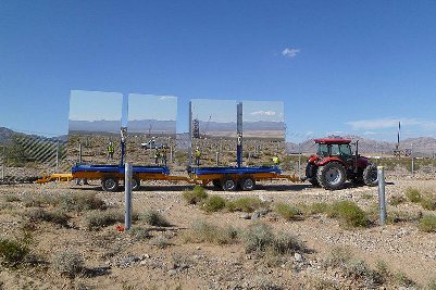 一旦它們完工,定日鏡就會被拖出來,拖到鏡子場地,這要用拖拉機。在圖前部,以及在鏡子中看到的,是一些柱子,定日鏡會被安裝在上面。來源:麻省理工科技創(chuàng)業(yè)公司