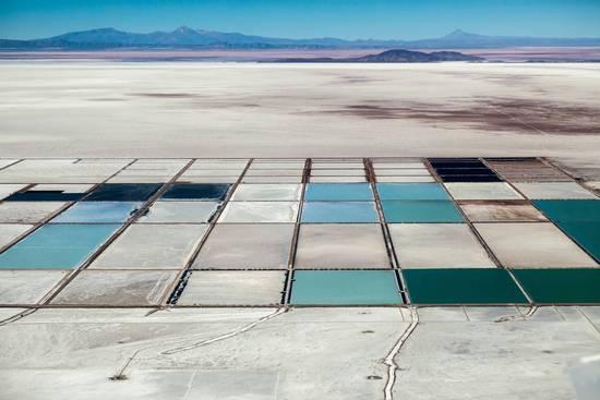 (圖示:玻利維亞的阿塔卡瑪高原。鹽水從附近的湖中抽出,注入一系列蒸發(fā)池中,并持續(xù)12至18個月。當溶液變得更濃時,不同的礦物質(zhì)會在不同的時間結(jié)晶。工廠會用石灰處理以除去鎂。當這些礦物準備加工時,它們會被帶到附近的Planta Li鋰工廠,生產(chǎn)用于制造電池的鋰離子。2017年,該工廠生產(chǎn)了20噸碳酸鋰。)