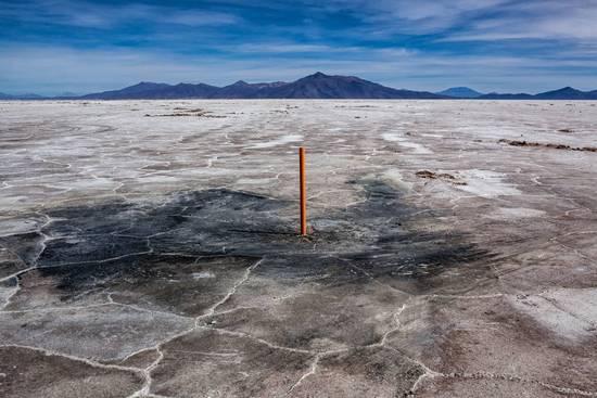 (圖示:玻利維亞的阿塔卡瑪高原。工人們在世界上最大的鹽堿地地表鉆孔。他們的目標是在富含大量鎂和鉀的鹽水中尋找鋰元素含量較高的地方。自21世紀以來,世界上大部分的鋰都是通過這種方式提取的,而不是使用礦砂資源。)