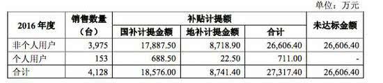除上述已到賬的政府補貼之外,北汽新能源還存在大量因沒有達到領(lǐng)取標準而未到賬的補貼資金。根據(jù)《2016補貼通知》,對非個人用戶購買的新能源汽車申請補貼,累計行駛里程須達到 3 萬公里(作業(yè)類專用車除外),補貼標準和技術(shù)要求按照車輛年度執(zhí)行。