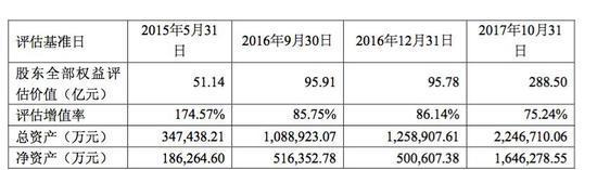 根據(jù)天健興業(yè)出具的《置入資產(chǎn)評估報告》顯示, 截至評估基準日2017年10月31日, 采用市場法評估后的北汽新能源估值為288.50億元,增值率75.24%,報告提醒投資者“充分關(guān)注評估增值的風險”。