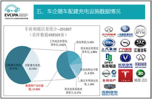 私人類充電基礎(chǔ)設(shè)施數(shù)據(jù)情況,截至2018年7月,通過(guò)聯(lián)盟內(nèi)成員整車企業(yè)采樣498569輛車的車樁相隨信息,其中建設(shè)安裝私人類充電樁336868個(gè),整體未配建率約32.43%,其中約17.8%是由于集團(tuán)用戶采購(gòu)純電動(dòng)轎車作為出租車、分時(shí)租賃用車等運(yùn)營(yíng)專用車輛而不需要車企隨車配建充電設(shè)施所致。另一方面,因私購(gòu)車的充電樁配建約為82.2%。
