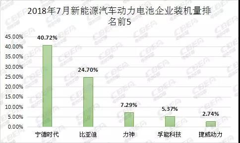 從不同電池企業(yè)來看,寧德時代以1.36 Gwh的裝機(jī)量位居榜首,占7月總裝機(jī)量的40.72%,對比6月增長三個百分點;比亞迪位居第二,裝機(jī)量為0.83 Gwh,占比為24.70%,對比6月下降近三個百分點;力神由6月排名第四上升一位,位居第三,裝機(jī)量為0.24 Gwh,占比為7.29%,對比6月增長兩個百分點。