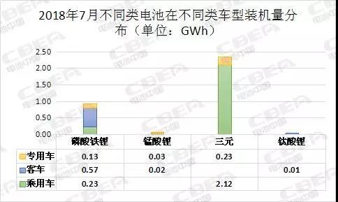 從不同類型電池來看,7月3.34Gwh裝機(jī)總量中,三元動力電池裝機(jī)量為2.35 Gwh,占比達(dá)70.26%;磷酸鐵鋰動力電池裝機(jī)量為0.93 Gwh,占比為27.81%;錳酸鋰動力電池裝機(jī)量為0.05 Gwh,占比為1.59%;鈦酸鋰動力電池裝機(jī)量為0.01 Gwh,占比為0.33%。