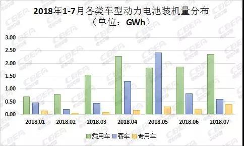 從車輛細(xì)分領(lǐng)域來看,2018年7月,我國新能源乘用車動力電池裝機(jī)量為2.35 Gwh,占比達(dá)70.36%,環(huán)比增長27.19%;新能源客車動力電池裝機(jī)量為0.60 Gwh,占比為17.95%,環(huán)比下降26.75%;新能源專用車動力電池裝機(jī)量為0.39 Gwh,占比為11.69%,環(huán)比增長98.20%。