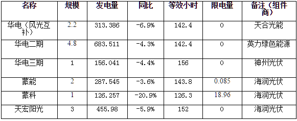 從各風(fēng)電場(chǎng)項(xiàng)目來(lái)看,華電風(fēng)光互補(bǔ)電場(chǎng)2.2萬(wàn)千瓦光伏發(fā)電場(chǎng)發(fā)電量為313.386萬(wàn)千瓦時(shí),等效發(fā)電小時(shí)約為142.4小時(shí);華電二期4.8萬(wàn)千瓦光伏發(fā)電場(chǎng)發(fā)電量為683.511萬(wàn)千瓦時(shí),等效發(fā)電小時(shí)約為142.4小時(shí);華電三期1萬(wàn)千瓦光伏發(fā)電場(chǎng)發(fā)電量為156.041萬(wàn)千瓦時(shí),等效發(fā)電小時(shí)約為156小時(shí),為我市7月份光伏等效利用小時(shí)數(shù)最高;蒙能新能源2萬(wàn)千瓦光伏發(fā)電場(chǎng)發(fā)電量為287.545萬(wàn)千瓦時(shí),等效發(fā)電小時(shí)143.8小時(shí);蒙科金太陽(yáng)1萬(wàn)千瓦光伏發(fā)電場(chǎng)發(fā)電量為126.257萬(wàn)千瓦時(shí),等效發(fā)電小時(shí)126.3小時(shí);天宏陽(yáng)光3萬(wàn)千瓦光伏發(fā)電場(chǎng)發(fā)電量為455.98萬(wàn)千瓦時(shí),等效發(fā)電小時(shí)152小時(shí)。
