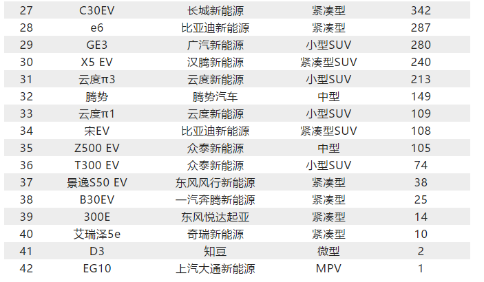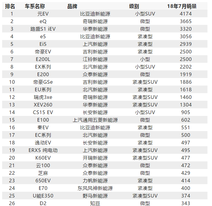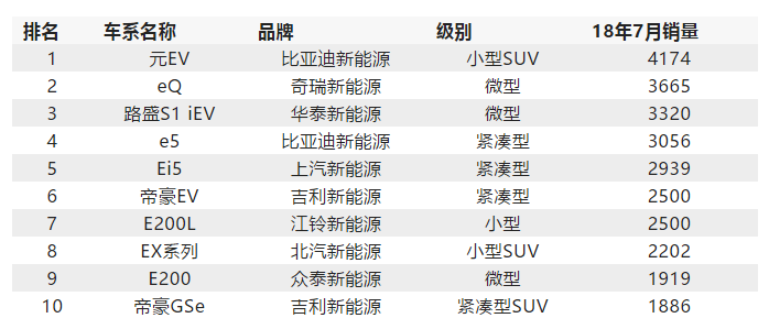 最后,我們來看一下7月純電汽車總排行榜