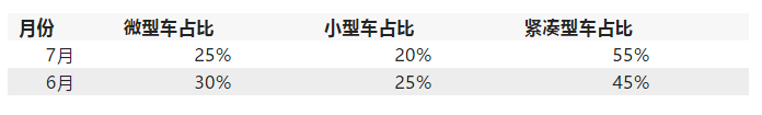 從下面的表格中也不難看出微型和小型車的比例在不斷減少,緊湊型車在逐步增加。(此數(shù)據(jù)從6、7月銷量前20中統(tǒng)計(jì)而來)
