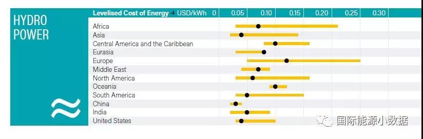 由上表可見,水電的全生命周期內(nèi)平準(zhǔn)成本在印度最低,其次是中國(guó)、美國(guó)、南美;歐洲平準(zhǔn)成本最高,其次是大洋洲、中美洲。