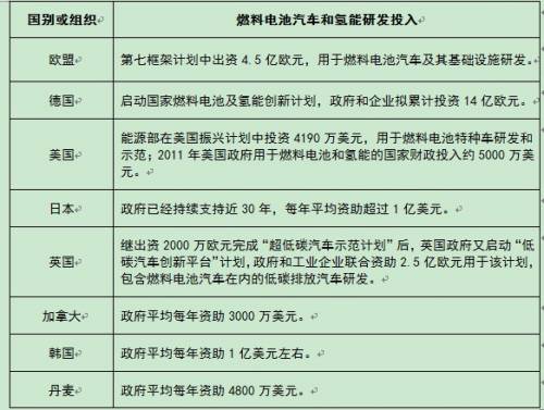 表3 全球主要組織、國家和企業(yè)投入燃料電池汽車和氫能研發(fā)資金統(tǒng)計表