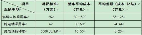 2009年初,財政部、科技部、國家發(fā)展改革委、工業(yè)和信息化部(以下簡稱四部委)聯(lián)合召開啟動會,共同啟動“十城千輛”節(jié)能與新能源汽車示范推廣試點工程,決定在公交、出租、環(huán)衛(wèi)、公務、郵政等公共服務領域開展節(jié)能與新能源汽車購買試點工作。與此同時,國家頒布了《節(jié)能與新能源汽車示范推廣財政補助資金管理暫行辦法》,燃料電池轎車、純電動汽車和純電動特種車均納入公共服務用乘用車和輕型商用車類,由于其具有100%節(jié)油率水平,分別獲得了國家財政補貼25萬元/輛、6萬元/輛和3000元/kWh標準,如表4。從補貼額度上看,燃料電池汽車獲得了更多的國家財政補貼額度,但是從財政補貼與整車成本差值平均值看,由于燃料電池汽車整車成本高,在獲得相應國家補貼之后,仍然存在很大的差額,這必將阻礙燃料電池汽車示范推廣。因此,政府應調(diào)整新能源汽車財政補貼標準,引導燃料電池汽車發(fā)展。