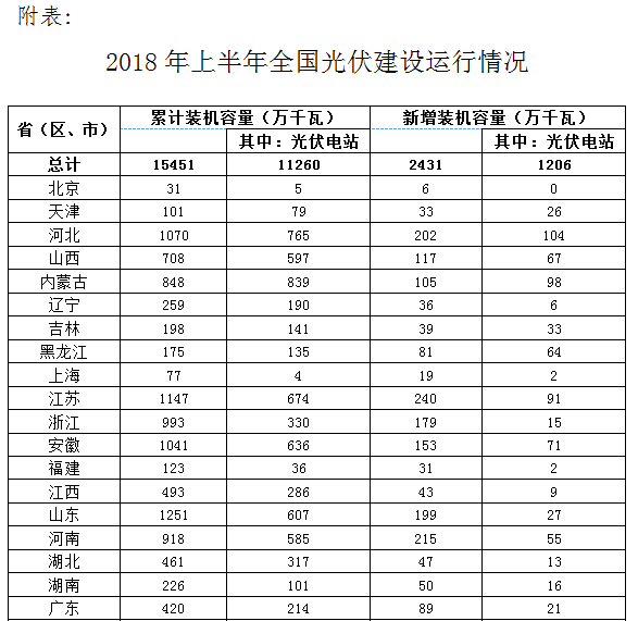 從新增裝機(jī)布局看,華北地區(qū)新增裝機(jī)611.6萬千瓦,同比增長47%,占全國的25.2%;東北地區(qū)新增裝機(jī)206.4萬千瓦,同比下降4%,占全國的8.5%;華東地區(qū)新增裝機(jī)621.8萬千瓦,同比下降25%,占全國的25.6%;華中地區(qū)新增裝機(jī)387.8萬千瓦,同比下降8%,占全國的15.9%;西北地區(qū)新增裝機(jī)412萬千瓦,同比下降1%,占全國的17.0%;華南地區(qū)新增裝機(jī)191.8萬千瓦,同比增長33%,占全國的7.9%。分布式光伏發(fā)展繼續(xù)保持較快速增長,2018年上半年山東、浙江、河南、江蘇四省新增裝機(jī)均超過100萬千瓦,四省分布式光伏新增裝機(jī)占全國的52.6%。