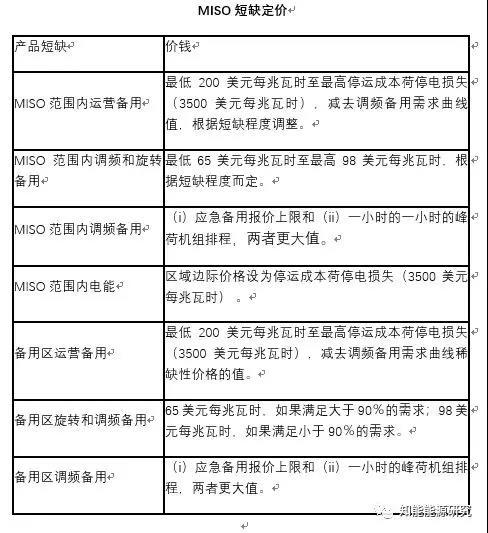 MISO將負(fù)傾斜的需求曲線與管理價格相結(jié)合,以建立電能區(qū)域邊際價格和運(yùn)營備用的市場出清價格,如下表所示。其中許多依賴于MISO的停運(yùn)成本荷停電損失,消費(fèi)者對停電的估計價值以及突發(fā)意外事故加劇運(yùn)營備用短缺而導(dǎo)致?lián)p失負(fù)載的可能性。MISO的停運(yùn)成本荷停電損失目前設(shè)置為3500美元每兆瓦時 。