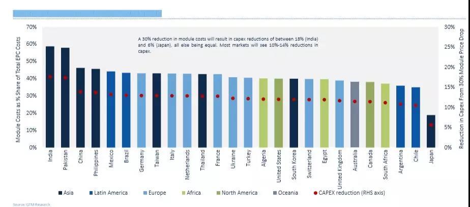 組件價格下降的好處主要體現在亞洲市場,在其他條件相同的情況下,組件成本降低30%將導致大多數市場的資本支出減少10%-14%。而印度資本支出將減少18%,日本資本支出減少6%,為亞洲最低。