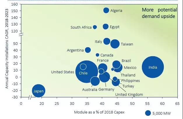 在印度,組件成本占公用事業(yè)規(guī)模太陽能項目成本的57%。組件成本下降約30%將導致總資本支出減少17%以上。此外,印度最近公布了關于延長投標項目的電網并網時間。這意味著將有更多的競爭性關稅被投標,盡管這可能會因組件的潛在進口關稅持續(xù)存在的不確定性而有所緩和。此外,它還可能導致安裝被推遲到2019-2022年。