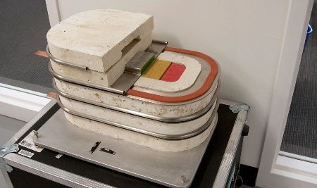 早期實物模型顯示堆疊的電池單元。厚厚的一層泡沫絕緣材料包裹著核心的電池。中心的彩色材料片代表熔化的電池材料。