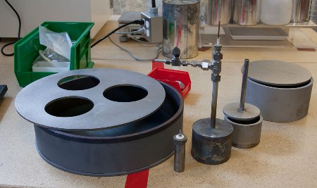 液態(tài)金屬公司已逐漸升級它的技術(shù)。這里顯示的是幾個電池,從一英寸寬的電池到公司最大的40厘米的電池(就是上面有三個孔的圓板)都有。在每個電池內(nèi),這兩種金屬都用作電極材料和鹽電解質(zhì)。金屬被加熱,直到它們?nèi)诨ü拭簯B(tài)金屬),然后自然分隔,形成三個不同層次,這是電池運行所需的。