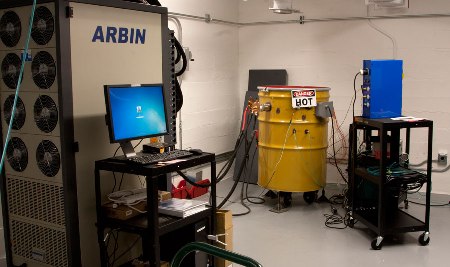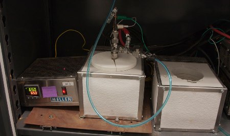 公司的大多數(shù)測試都是用4英寸的電池進行的。這里顯示的電池是在絕緣加熱器內(nèi)。電池內(nèi)的電極和電解質(zhì)在室溫下是固體,但需要熔化,以供電池運行。在這種情況下,電池被加熱到650℃,但是,電池通常運行于500°C。在熔融狀態(tài)下,電極材料的導電性是很高的,這就使電池充電和放電都很迅速。